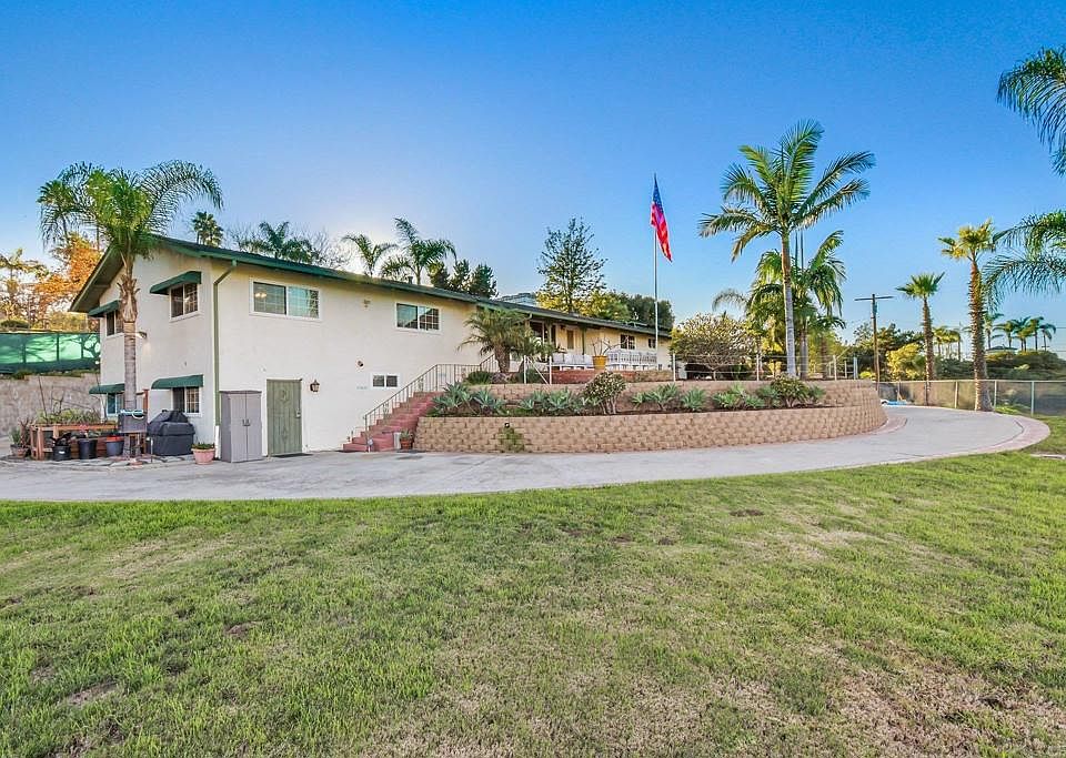 Welcome to 173 Pepper Tree Rd, a rare opportunity to own nearly one acre of private, usable land in the heart of Chula Vista. This trophy property offers space, flexibility, and timeless upgrades throughout. The light-filled formal living and dining areas are enhanced by elegant crown molding, travertine tile, and true hardwood floors. The spacious kitchen is perfect for entertaining, featuring custom maple cabinetry, granite countertops, stainless steel appliances, and a versatile center island ideal for gatherings and everyday living. The family room overlooks the grounds and opens to multiple courtyards, creating effortless indoor-outdoor flow. The primary suite feels like a retreat with dual sinks, a Roman soaking tub, and a steam shower. The main level includes 3 bedrooms and 2 full bathrooms. Downstairs, you’ll find a fully equipped 1-bedroom, 1-bath apartment with its own kitchen, ideal for extended family, a private workspace, or supplemental rental income. A wrap-around driveway accommodates RVs, multiple vehicles, and storage, while paid-off solar adds long-term value. This is a truly unique San Diego offering.