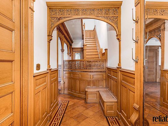 The parlor floor above is rich in period detail, offering a gracious sitting room, formal dining room, and library. Original woodwork, two sets of functioning pocket doors, decorative wooden arches, intricate parquet floors, and five fireplaces fill the home with warmth and authenticity.