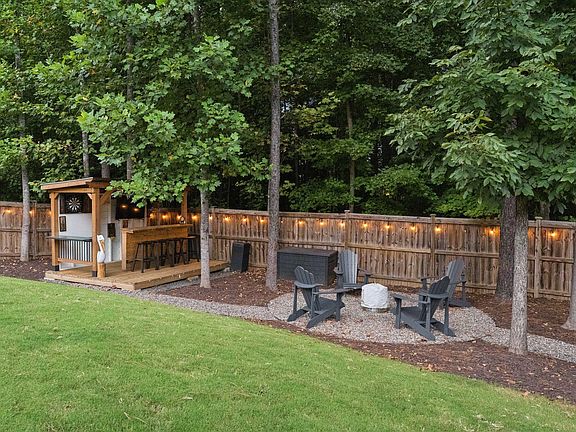 An entertainer's paradise from start to finish! The crown jewel of this home is the incredible backyard — a private retreat designed for gathering, relaxing & making memories. Enjoy a custom-built outdoor bar, covered patio, string lighting, built-in seating, lush landscaping, and a fire pit perfect for crisp fall nights & game-day get-togethers. It's the kind of space you'll never want to leave. Inside, the open layout is equally impressive. The modern kitchen features quartz countertops, stainless steel appliances, tile backsplash, & a large island that flows into the main living area — perfect for hosting & everyday living alike. Just off the kitchen, a stylish butler's pantry / bourbon bar adds a touch of sophistication & extra space for serving, storage, or your favorite evening pour. Upstairs, unwind in the movie loft complete with a projector & screen, creating the ultimate home-theater experience. The primary suite offers a tray ceiling, walk-in closet, and spa-style bath with dual vanities, soaking tub & glass shower. Two additional bedrooms provide plenty of room for guests or office space. Additional highlights include a 2-car garage, low HOA, & quick access to shopping, dining & downtown Raleigh. With its show-stopping backyard, upgraded interior & thoughtful design, this home is made for those who love to entertain.