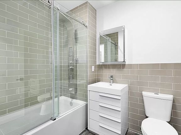 Our luxury Apartments features open kitchen living and dining room layouts highlighting the Brooklyn skyline views. Enjoy dining in your modern Italian kitchen featuring a amazing backsplash, stainless steel fridge, and stove. The kitchen is open to the dining/living room area & is generously lit by the big sliding doors leading to your own private outdoor space. Walk into your beautifully designed white Italian porcelain finish bathroom.