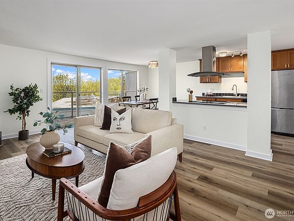Bright corner retreat with partial Lake Union views! This peaceful 4th-floor unit offers rare serenity with no one above. Nestled beside Trolley Hill Park, it features a stylish designer kitchen with updated flooring, shaker cabinets, and stainless steel appliances. A spacious balcony extends the living space, while the primary and second bedrooms sit near a full bath. Enjoy convenience with secure parking, in-unit laundry, and generous storage. Ideally located in Queen Anne with a well-run HOA—just minutes to Seattle Center, SLU, the Gates Foundation, local dining, coffee spots, and quick access to Highway 99. A quiet, urban escape with no upstairs neighbors!