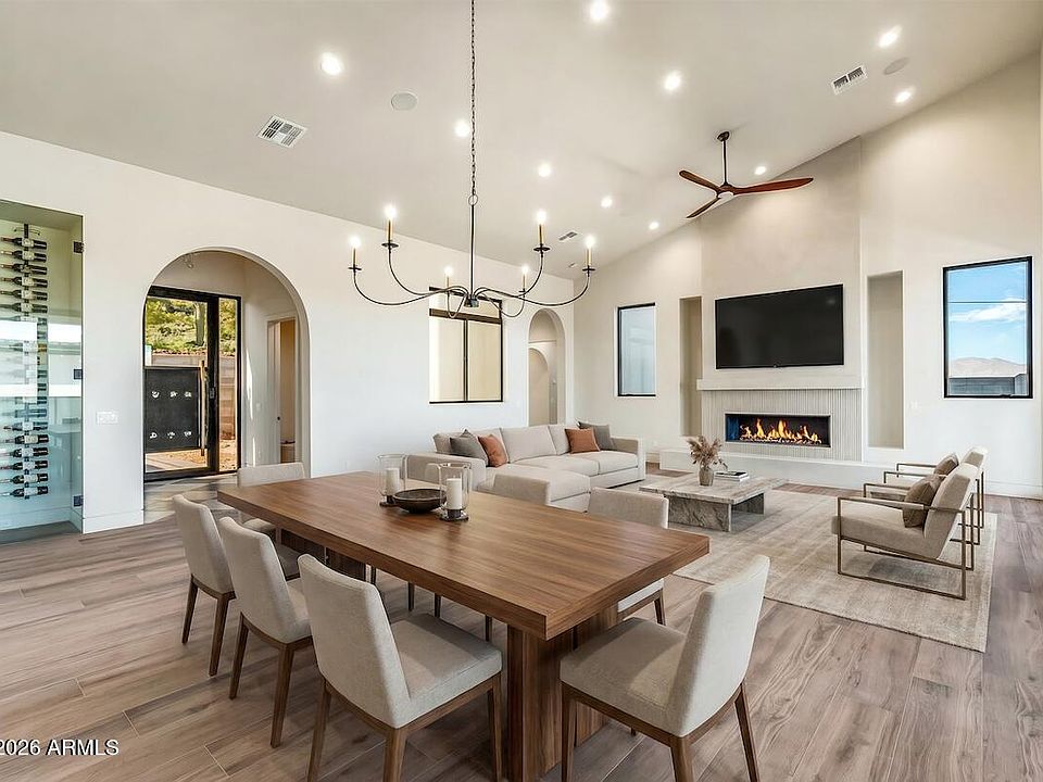 This exceptional property is a dream come true for car collectors and entrepreneurs alike, offering an extraordinary blend of living, garage, office, and shop space. Scheduled for completion in February 2026, the estate features three separate buildings with a total of 9,597 square feet under roof: a main residence, a guest house, and a detached garage with shop. The main home includes a 3-car attached garage, while the 3,147-square-foot detached garage/shop can accommodate 3 to 8 vehicles, making it ideal for collectors, hobbyists, or business owners. Located in a no-HOA area of Phoenix, this 3,272-square-foot meticulously crafted residence offers 3 bedrooms and 2.5 baths on a 1.265-acre premium lot with breathtaking mountain, sunrise, and city-light views. The thoughtfully designed split-floor plan places the primary suite on the south side of the home and two additional bedrooms on the north. High ceilings, expansive windows, and large glass doors flood the interior with natural light, creating a bright and open atmosphere throughout. The private backyard is a true retreat, featuring low-maintenance desert landscaping, a heated play pool with spa, and multiple outdoor seating areas perfect for relaxing or entertaining. The 556-square-foot guest house is fully self-sufficient for short- or long-term stays and is built with the same high-end materials and finishes as the main residence. A rare and remarkable opportunity to own a one-of-a-kind desert estate designed for luxury, lifestyle, and versatility.