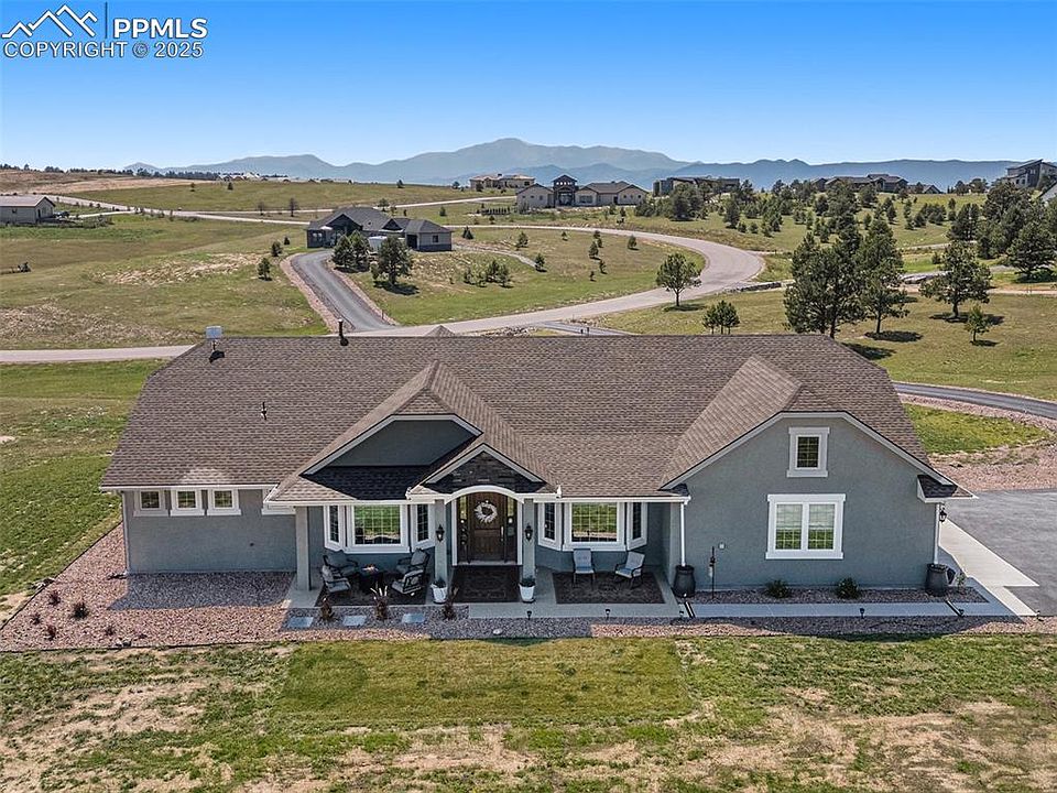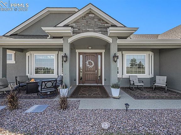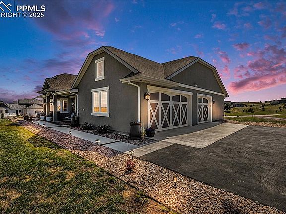 Rare and exquisite 2 year old custom ranch floor plan home by Karilla Homes with main level living and no basement on 3.52 acres! Zoned for horses with plenty of room for outbuildings! This beautiful 3-bedroom, 2-bathroom home is thoughtfully designed for comfort, convenience, and style. From the pellet stove in the living room to the custom Murphy bed with desk, every detail has been carefully considered. Designer finishes include granite countertops, marble basins, engineered wood flooring, under-cabinet lighting, and elegant custom window treatments, with select furnishings included. Accessibility is built in, featuring a spacious roll-in shower in the master suite. Outside, the property shines with fresh landscaping, including new sod, shrubs, and trees, along with rock accents, a blacktopped driveway, and reseeded grounds. The lot offers plenty of room for expansion or animals, while the garage adds extra storage with a pull-down attic ladder. This home is surrounded by newer custom homes with significantly larger square footage, all with acreage. With over 3 acres of land this home is an oasis! Best of all, the setting is extraordinary—enjoy sweeping views of Pikes Peak, rolling hills, and meadow valleys from nearly every room. Quiet and private, yet comfortable in size, this Karilla home offers the perfect blend of serene country living and modern design.