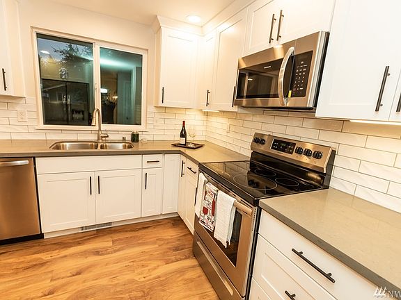 Completely remodeled 3 BR home in desirable Mays Pond w/community pool. New Milgard thermal windows. white shaker cabinets, white subway tile, quartz countertops, under-cabinet lighting & stainless appliances. Dining adjacent to kitchen with bar. Enjoy entertaining on your deck overlooking the expansive landscaped yard. New wood laminate flooring & plush carpets. Upgraded bathrooms, 2 fireplaces, huge rec room, separate utility & 1/2 bath. Large garage, insulated gar doors & openers