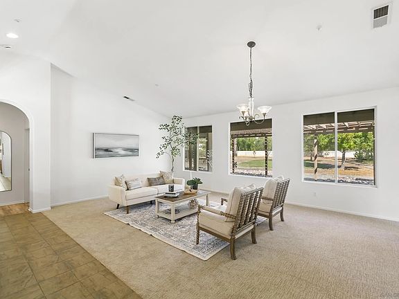 Step into a home that welcomes you with soaring vaulted ceilings and abundant natural light streaming through its many windows. The expansive living spaces include a massive kitchen, a grand living room, and a cozy family room—perfect for hosting or unwinding. At the heart of the kitchen is two spacious sit-in bars with seating for up to eight, creating the ultimate gathering spot for friends and family. Experience the best of California living with a seamless indoor-outdoor flow, thanks to large sliders on both sides of the home. The backyard is a true entertainer's dream, featuring shaded pergolas, park-like views, and breathtaking mountain backdrops. Enjoy unmatched privacy with no neighbors behind, to one side, or in front of you. Trails nearby offer outdoor adventure, while the RV parking accommodates all your desert toys. This nearly acre-sized lot, one of the largest in the community, is entirely flat and brimming with potential—perfect for an ADU, pool, or sports courts like Pickleball, tennis, basketball, or volleyball. The spacious primary suite is a retreat in itself, complete with a luxurious ensuite featuring a soaking tub, shower, and dual sinks. Convenience abounds with plentiful storage, a laundry room with a sink, and a three-car garage with space for four vehicles. Modern upgrades include brand-new carpeting, fresh interior paint, a new HVAC system, and fully paid-off solar panels at closing—ready for you to turn the key and move right in.