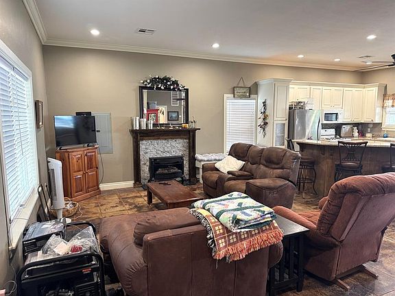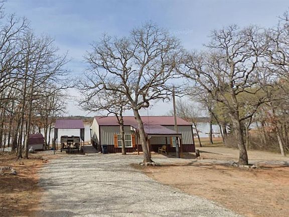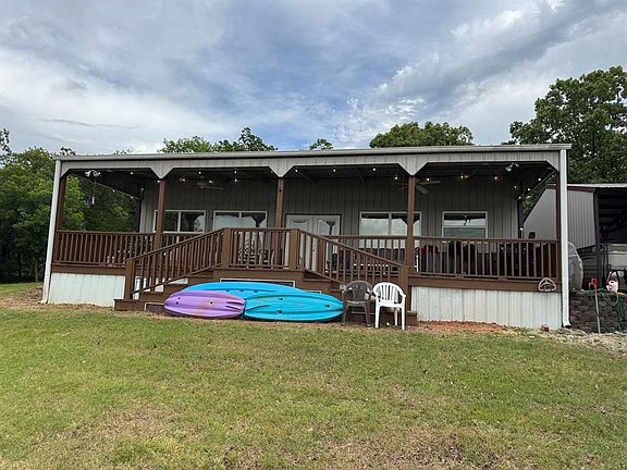 Enjoy serene lakefront living at Shawnee Twin Lakes in this charming 1,200 sq ft retreat featuring two bedrooms and two full baths. An open floor plan connects the living area—anchored by a cozy fireplace—and the kitchen, where a breakfast bar invites casual dining and conversation. Large windows and French doors face the lake, creating a seamless visual connection to the water and the large covered deck beyond. Built with durable metal siding and a metal roof, you'll appreciate the long-term peace of mind with minimal maintenance. The carport’s generous size easily accommodates your boat and vehicle, making lake adventures effortless. Lot is leased with City of Shawnee (30 year lease)