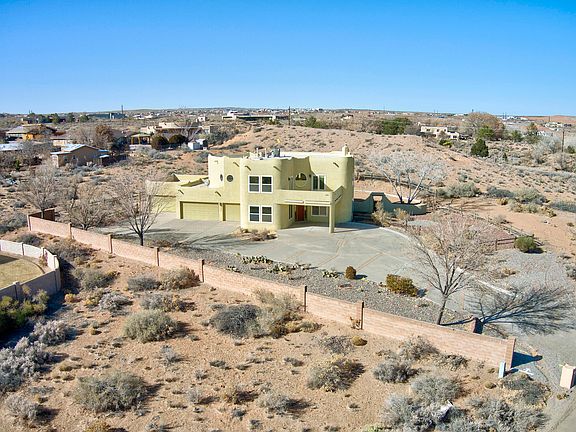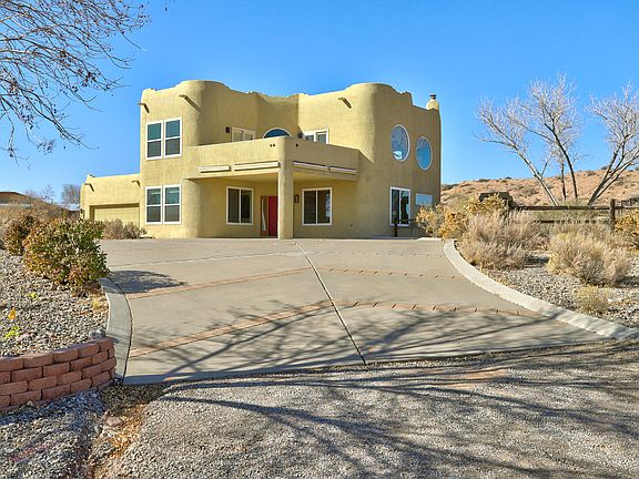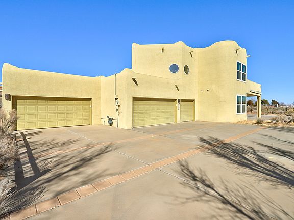 Situated on 1.12 acres of classic NM landscape, this 3,668 sf custom pueblo-style home with 5 car garage is designed for spacious living and elegance. Created for convenience, the home features a downstairs bedroom and bathroom, perfect for guests or multigenerational living. The large kitchen with breakfast nook is ideal for casual dining, while multiple living areas including a formal dining room, loft, and 2 separate living spaces provide ample room for entertaining. Enjoy wonderful natural lighting throughout the home, enhanced by beautiful circular windows that add unique architectural charm. Take in breathtaking views especially from the upstairs balconies. A standout feature is the circular sunroom with pellet stove to enjoy year round. Peace of mind with a new septic tank in Jan!