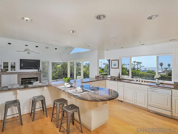 Situated within the coveted Beach Colony neighborhood, this exceptional property offers a view-enhancing elevation overlooking Del Mar's stunning coast. Enjoy panoramic ocean views from the moment you step foot into this open and airy home. The living room features vaulted ceilings and a granite-surround fireplace. French doors lead onto a wrap-around terrace, perfect for enjoying some of nature's most dazzling sunsets. The kitchen features a spectacular coastline view through expansive windows,