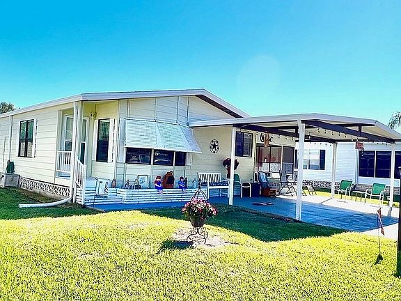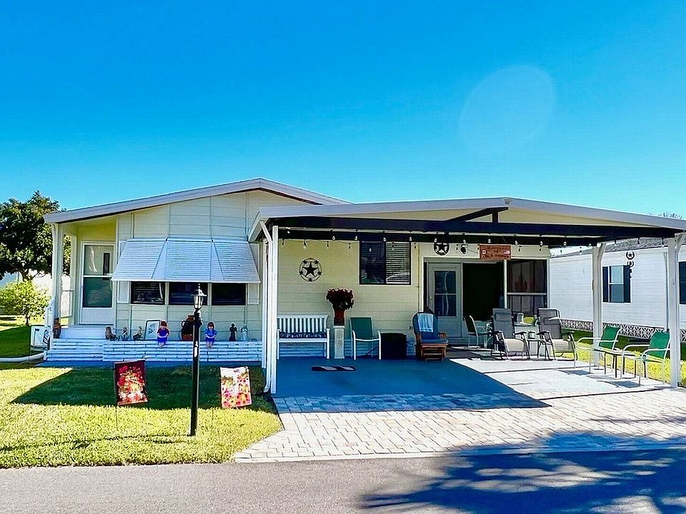 Welcoming you home is the Carport Covered Grand Double Driveway. Close by is the covered sitting area and Large Florida room. As you enter through the front door you will have the warm and cozy living and dining room space. Just around the corner is the kitchen and spacious breakfast nook. Down the hall is the 2 bedroom and across from it is the main bathroom. Perfect for all this family and friends who will be visiting. If you keep going you will enter the Master bedroom, walk in closet and en-suite with a shower. There are plenty of closets and cabinets for storage throughout the house. And let us not forget about the Shed for all of tools and toys. Down the road are the pool, hot tub, clubhouse, dog park, pickle ball, corn hole, put out golf and many planned activities just for you. Approximately 20 minutes away is Disney, with all its attractions, Fine dining, shopping, physicians, hospitals, and much more. Pass-through tax is $52.00 a month (approx $624 a year), and the Premium Spectrum package is $137.80 a month