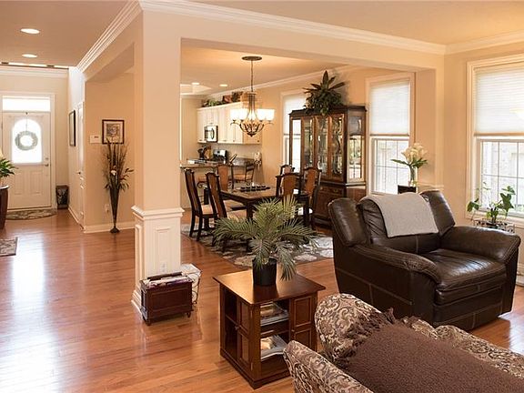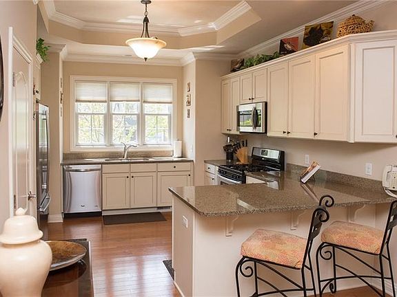 Executive style, maintenance free living, in a sought-after sidewalk neighborhood*Glistening hardwood follow & soaring ceilings greet you & flow through the spacious entry, family room, dining room & kitchen*The kitchen boasts granite countertops, crazed cabinets, and stainless steel appliances, all overlooked by a premier tray ceiling with crown moulding*It's a very open concept*2 Elegant pillars with wainscoting are the only visuals separating the main rooms of the first floor*A gas fireplace in the family room is a focal point*Crown moulding is accented throughout the main floor*Sliding glass doors lead you to a private patio with gas grill & retractable awning*The elegant Master Suite features a ceramic shower & leads to the master closet with custom shelving and a second access to the laundry room*Upstairs are 2 huge bedrooms & another well-appointed full bath*The lower level has a bedroom, den, full bath, game room & a flex room, perfect for guests or teens*Maintenance free and