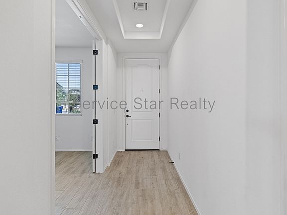 Upgrades include cabinetry, 8-foot interior doors, and durable wood plank tile in high-traffic areas. The bathrooms feature tasteful carpeting, while the master bath is designed with a tiled shower, a dual sink vanity, and unique open linen cabinets.