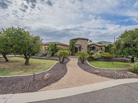 Experience old-world luxury living in this Santa Barbara-style estate, nestled at the base of the mountains with breathtaking views in every direction. Surrounded by mature trees that feel more like Sicily than the desert, this private retreat sits inside an exclusive gated enclave of only seven homes. Inside, soaring coffered ceilings and a floor-to-ceiling windowed atrium bring light and grandeur to every room. Travertine tile with custom stone inlays, real wood doors with bespoke hardware, and timeless finishes set a warm, elegant tone. The chef's kitchen features dual islands, granite counters, a gas range with matching KitchenAid appliances, and a cabinet-front refrigerator, with rich wood cabinetry carried throughout the home. The primary suite offers double-door access to the backyard, a spa-like bath, and a massive walk-in closet with sitting room. Multiple flex spaces allow for dining, game room, or media use.