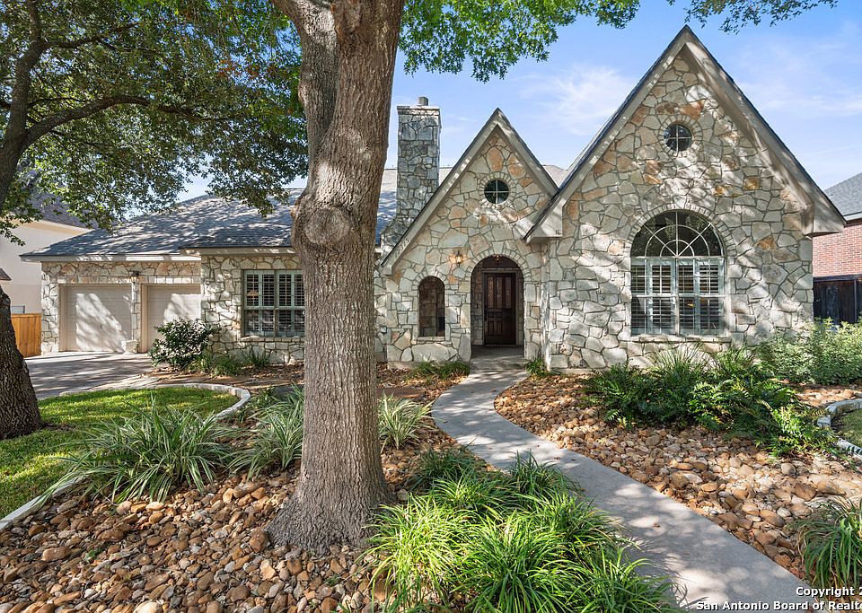 Welcome to 17315 Fountain Bluff, an impeccably maintained one-story, cottage-style gem in The Fountains at Deerfield-part of the sought-after Eclectic Cottages by Bill Cox. This 3-bedroom, 2.5-bath home offers 2,310 sq ft of Old World charm complemented by thoughtful modern updates. Situated on a beautifully manicured, professionally landscaped lot, the stone exterior and arched front door set the stage for the character found throughout. Inside, you'll find ultra-high ceilings in the family room and kitchen, plantation shutters, and a striking floor-to-ceiling stone fireplace. The updated primary bath and closet-along with the refreshed secondary bath-add a refined, modern touch. The kitchen features large tile flooring, granite countertops, and a timeless subway tile backsplash. Major improvements include an HVAC system replaced in 2019 and a roof installed in 2020, providing valuable peace of mind. Enjoy tranquil outdoor living on the covered rear porch overlooking a serene, private yard. Overflowing with charm, warmth, and personality, this one-story Bill Cox cottage is truly a must-see.