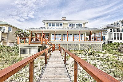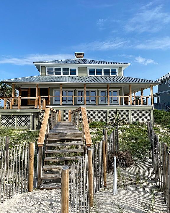 Spectacular Gulf-front home located on St. George Island Plantation (Eastpoint, Florida) Built by renowned William Solberg for the original developer of The Plantation. Soaring 9' ceilings and walls lined with Heart-pine tongue & groove wood locally milled in Carrabelle. Recent renovation includes New Anderson impact-resistant windows and French Doors deliver gorgeous views of your private beach and sensational sunsets. Live your dream on the Gulf of Mexico! A wood-burning fireplace warms the open living room, dining room, and kitchen areas of the home. Screened and open wrap-around porches overlook the gulf waters. 2 bedrooms downstairs feature updated bathrooms with custom tile showers. Master suite and retreat located upstairs with its own fireplace, sitting room/study, and beautifully updated bath…wait till you see the shower and jetted tub! New Elevator to all floors. Extensive upgrades include 2021 Aluminum roof, Double HVAC units replaced with new metal ductwork in 2021. New hot water heaters, security system, and exterior irrigation system, too. New Hardie-board siding and exterior paint all done 2021. New heart-pine railings on the deck and private beach walk-over done. A truly beautiful home…a must-see for the most discriminating buyer.