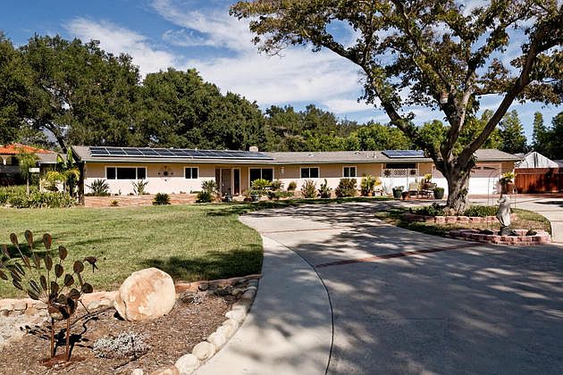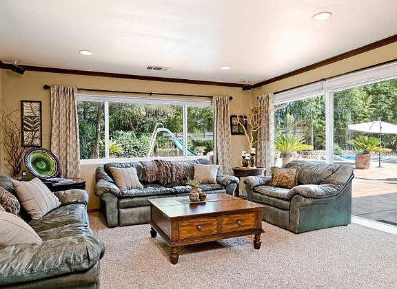 HILLTOP PARADISE! Kick off your shoes & relax because this is resort living at home. This gorgeous home has it all: views, privacy, pool, outdoor living space w/ covered airy breeze way & fire pit, granite, newer dual paned windows and sliders, newer travertine tile flooring, solar panels, newer stainless steel appliances, A/C, built-ins and more. This 3 bedroom 2.5 bath home is impeccably maintained & includes a great room w/dining area, breakfast bar, fireplace & family room that all overlook the pool & spa. Large living room with entertainment center, built-ins and fireplace. Large garage, Lots of parking, RV space, hookups & more.