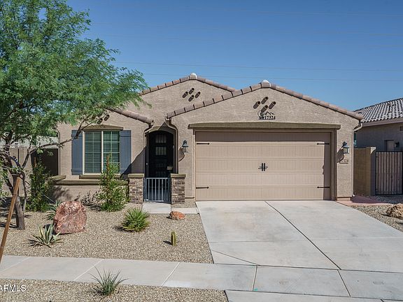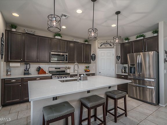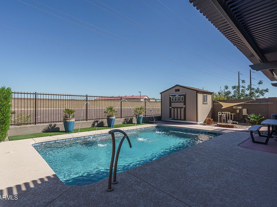 Sitting on a premium homesite backing the wash, this beautifully updated home has 3 bedrooms + den & 2 baths in 1719 SqFt with an open great room layout. The kitchen has been remodeled & features espresso maple soft-close cabinets with roll-out drawers, quartz counters & backsplash, stainless appliances, a walk-in pantry, & island with breakfast bar & upgraded pendant lights. Sliding doors open up to a fabulous backyard with a refreshing pool with water features & in-floor cleaning, artificial turf, an 8x10 storage shed, & view fencing. The primary has a full bath with double sinks & separate tub & shower & a walk-in closet. Other features include rain gutters, laundry cabinets, and a 2-car garage with overhead racks & cabinets.