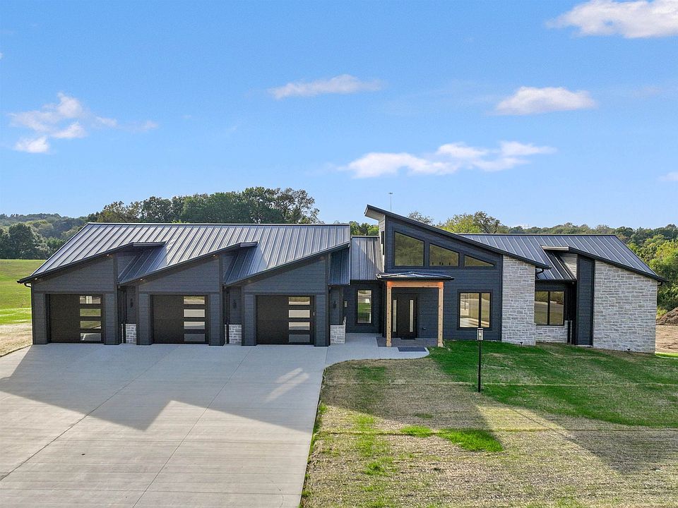 Set on a picturesque 1-acre lot in Wildflower Ridge subdivision, this approximate 4,308 sq ft New Construction home offers 5 spacious bedrooms and 4-full & 1-half, well-appointed bathrooms. Crafted by Sunrise Development Group, the residence makes a bold statement in modern architecture with a dramatic exterior blending dark charcoal siding, light stone accents, and a bold standing seam black roof. Once inside, there is an expansive open-concept layout, where light-toned engineered hardwood floors and oversized minimalist windows create an airy, light-filled ambiance. The main floor living room features a sleek fireplace flanked by custom built-ins and opens to a private deck with tranquil views—ideal for relaxing or entertaining as the sun sets. Additional highlights include a stylish modern pantry/scullery complete with cupboard organizers, a fully equipped main floor laundry room, and a convenient lower-level laundry hookup. The lower level also offers a custom designed bar complete with sink, dishwasher and fridge/freezer, and recreation room that seamlessly transitions into a cozy secondary living area—perfectly balancing form and function throughout the home.