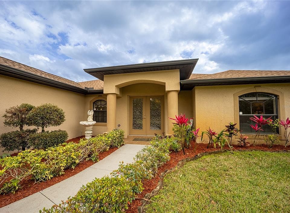 CUSTOM BUILT 2010 ~~FULLY FURNISHED ~~POOL HOME~~~ located on a DOUBLE LOT in the heart of Central Port Charlotte. Designed with both comfort and style in mind, this property offers the perfect blend of modern upgrades, timeless features, and plenty of space to relax and entertain. New Roof (2022), with hurricane protection, gutters and an irrigation system on well. Welcoming Great Room: Cathedral ceilings, pocket sliders, and an open, airy design that seamlessly connects indoor and outdoor living. Gourmet Kitchen: Granite countertops, stainless steel appliances, and an open-concept layout perfect for gatherings. Architectural Touches: Bullnose corners, plant shelves, and elegant arches throughout. Primary Retreat: Tray ceiling, walk-in closet, and a spa-inspired ensuite with dual sinks, a soaking tub with additional showerhead, and separate walk-in shower. Easy Living: Tile flooring throughout and an inside laundry room for convenience. Outdoor Oasis: Enjoy your heated pool with a rescreened cage and safety baby gate, an outdoor shower, and a spacious lanai ideal for Florida living. A detached shed provides extra storage for tools and toys. Bonus: This home is being offered fully furnished—just bring your suitcase and start enjoying your slice of paradise!