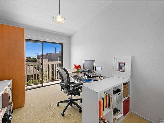 This bright Golden Hills home is situated on an elevated lot just minutes from the beach. It boasts the preferred and rare floor plan of all three bedrooms upstairs, with the perfect orientation to allow all rooms to be bathed in natural light and ocean breezes. The inviting living room has high exposed beamed ceilings and a striking fireplace. The over-sized sunny kitchen opens to the rear deck and yard, perfect for entertaining. Rounding out the first floor is a formal dining room, and a separate laundry room with additional storage. The large primary suite with soaring ceiling has a walk-in closet and opens to a private deck providing great views of the mountains and city. The other two bedrooms boast high ceilings and open to the rear balcony. This home has direct access to a two car garage with build-in cabinets. It is on a quiet one-way street close to restaurants, shopping and top rated schools.