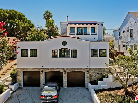 Possibly the nicest duplex in Westwood, this rare offering is located on a quiet street south of Wilshire and west of Westwood Blvd. The tiered layout faces east, south, and west, providing great sunlight and views to Century City and Wilshire Corridor. The flexibility and design is like having two homes on a lot with its six-car parking in front (3 garages). The front three-bedroom is on the street side and is remodeled with hardwood floors, a newer chef's kitchen, and a large patio. The rear home features an open floorpan with living, dining, and kitchen, all looking into the yard. Upstairs is an oversized three bedroom layout with a private master suite and deck facing Century City. There is also a second oversized deck off the other two bedrooms. In the rear is a grassy yard, patio lounge area, and large white wall, ideal for entertaining and a projection TV. The back unit is stunning and staged.