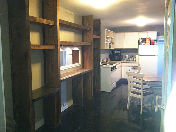 The first floor offers an open-concept living area ideal for entertaining, with custom woodwork, a built-in bar, and a cozy atmosphere. The eat-in kitchen includes custom beam shelving, plenty of pantry space, and room for group meals or study sessions.