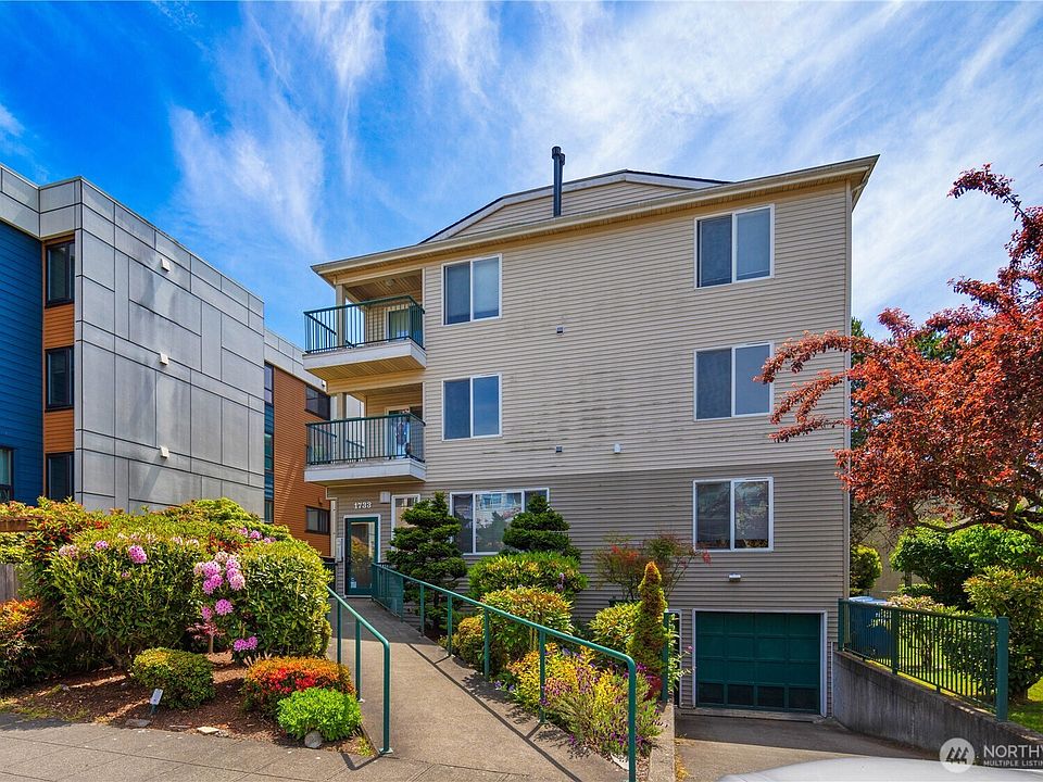 A a rare unit with two dedicated parking spaces! 2nd space ideal for smaller car or scooter. And the most dramatic sunsets facing West! This light filled & spacious condo is only blocks from Market St and historic Ballard Ave, providing easy access to all Ballard has to offer while still being located on a quiet residential street. This 2 bed/1.75 bath layout has just been fully re-carpeted and re-painted and comes complete with an in unit washer & dryer off kitchen dining area, open living room/great room concept, large balcony, and private storage space in garage, making this a must see! Parking spaces in secured garage. There is a fenced garden/BBQ area on back of bldg. Up to 2 cats, dogs only w/board appr. no dogs. Rent cap of 2 met.