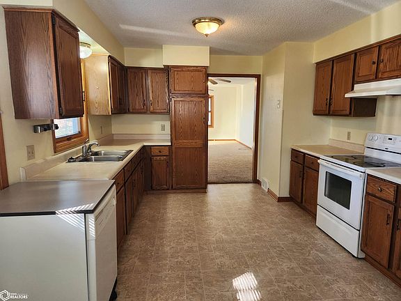 Enjoy the Amenities of small town Iowa living in this well maintained 3 Bed / 1.75 Bath home ~ Nice eat-in kitchen with lots of cabinets/counter space, large living room, bedrooms and spacious bath complete the main level ~ Unfinished walk-out basement provides ¾ Bath, laundry and great potential for more living space, plus plenty of storage space ~ Enclosed breezeway connects to roomy 2 car garage ~ Nice size corner lot yard ~ Pella Windows with slim shades, electric water heater (2020), siding and roof repairs after 2008 tornado, appliances convey, carpet recently cleaned ~ Make your move now! All information obtained from Owner and Public Records.