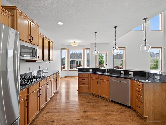 Beautiful 5-Bedroom Home in Top-Rated Wayzata School District – Walk to High School! Located in a quiet cul-de-sac within the highly sought-after Wayzata School District, this spacious 5-bedroom, 4-bath home offers the perfect blend of comfort, style, and convenience. Just a short walk to the high school. Step inside to a bright and airy main level featuring a dramatic two-story foyer, a sunlit family room with vaulted ceilings and floor-to-ceiling windows, and a gourmet kitchen with granite countertops, stainless steel appliances, double ovens, a walk-in pantry, and ample cabinet space. A formal dining room, laundry room, and guest bath add to the home's functional layout. Upstairs, you’ll find a spacious loft and three large bedrooms, including a luxurious primary suite with a walk-in closet and spa-like bath with dual vanities, a soaking tub, and separate shower. The finished walkout lower level is perfect for entertaining, with a generous rec room, fifth bedroom, full bath, and abundant storage. Freshly updated with modern paint and brand-new carpet throughout, this home is move-in ready. Enjoy your mornings on the welcoming front porch and your evenings on the expansive deck or patio overlooking a tranquil pond and gorgeous sunsets. The fenced back yard completes the picture. Don’t miss this rare opportunity in a prime location!