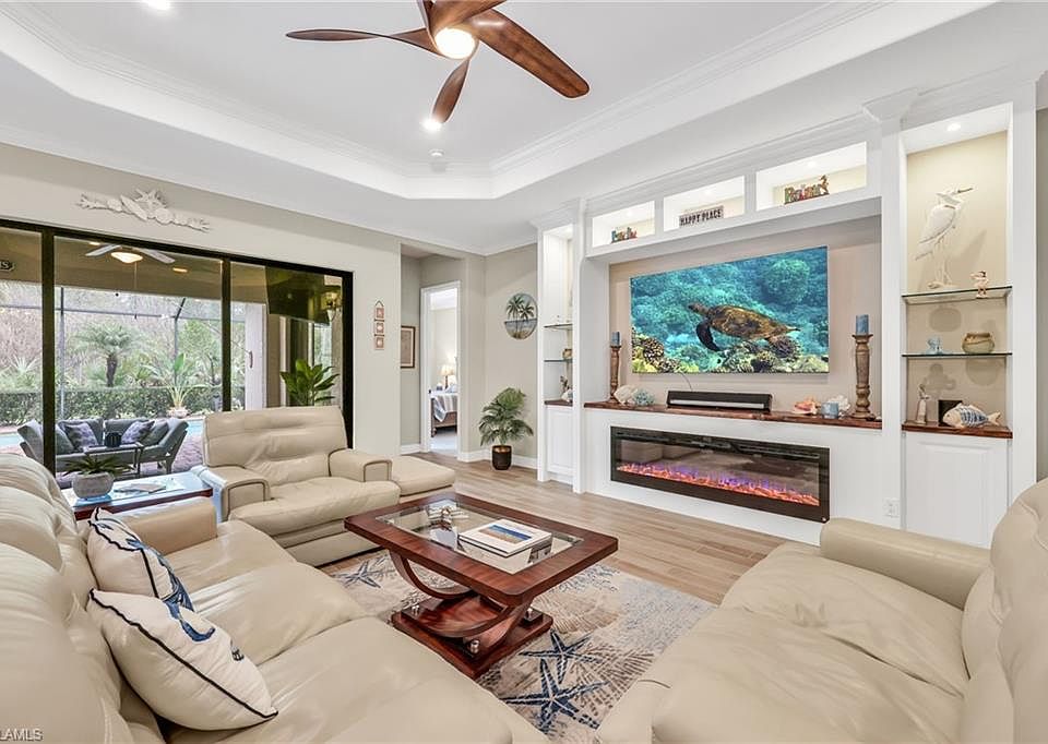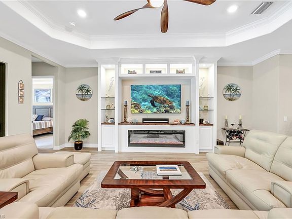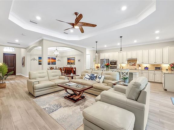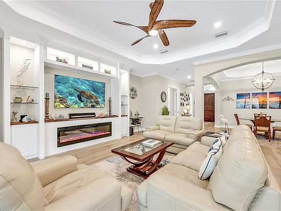 *SOCIAL MEMBERSHIP INCLUDED* Nestled on a peaceful preserve lot in the highly sought-after gated community of Bonita National Golf & Country Club, this meticulously maintained and thoughtfully upgraded 3-bedroom, 2-bath home offers the perfect blend of comfort, style, and convenience. The open-concept layout showcases plank tile flooring in the main living areas, soaring coffered ceilings, crown molding throughout, recessed lighting, and abundant natural light. The upgraded kitchen is a chef’s delight, featuring granite countertops, stainless steel appliances, a NEW dishwasher, walk-in pantry, spacious center island, and a refrigerator with instant hot water—ideal for both everyday living and entertaining. The expansive living room is enhanced by custom built-in shelving and a cozy fireplace, creating an inviting space to relax or host guests. Step outside to your private oasis—a spacious screened lanai with designated areas for both sunbathing and covered outdoor dining. Enjoy the fully equipped outdoor kitchen, sparkling saltwater pool (NEW PUMP 9/2025), and relaxing spa, all set against a serene preserve backdrop that ensures privacy and tranquility. This home is loaded with valuable upgrades, including impact-resistant windows and doors, solar panels for energy efficiency, and an epoxy-coated 2-car garage. The laundry room includes a utility sink and comes equipped with a washer and dryer for added convenience. Best of all, the property is located outside of a flood zone for added peace of mind. As a bonus, a social membership is included—no golf dues required. Enjoy resort-style amenities including a waterfall pool, tennis courts (pickleball coming soon), full-service spa, fitness center, and on-site dining at the elegant clubhouse. All just minutes from the Gulf beaches, fine dining, shopping, and entertainment. Additional recent care includes a professionally power-washed roof, keeping the home’s exterior looking fresh and well-maintained.