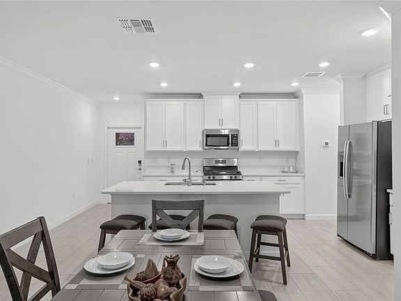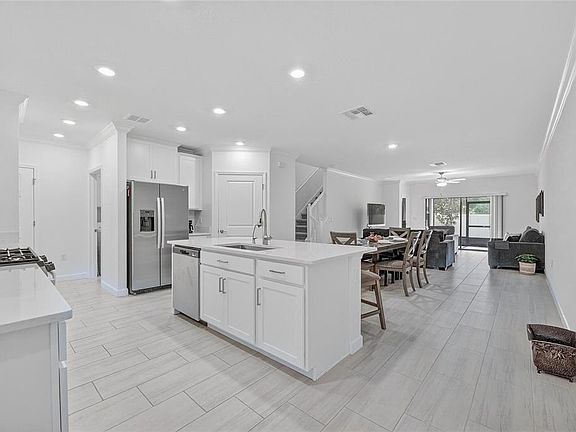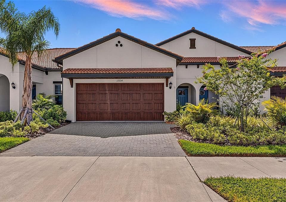 **ASSUMABLE VA 4.375% LOAN (loan can be assumed by either Veteran or Non-Veteran) Motivated Seller, Offering the PRISTINE condition of new construction WITHOUT the wait, this home has seen MINIMAL USE. Discover this stunning 1,737 SQFT, 2-bedroom, 2.5-bathroom, PARTIALLY FURNISHED home, in the vibrant and luxurious 55+ Active Adult Community that is Medley at Southshore Bay. This meticulously designed two-story Villa offers a perfect blend of comfort and style. Step inside via two-car garage or front door to an inviting OPEN-CONCEPT first level. Here, you'll find a spacious kitchen with MATCHING GE APPLIANCES, White Cabinets, and QUARTZ COUNTERTOPS. The GREAT ROOM with CROWN MOLDING throughout is ideal for ENTERTAINING. Enjoy seamless indoor-outdoor living with a TILED and SCREENED covered back PATIO, perfect for al fresco dining or simply relaxing with a cup of coffee. The owner's suite, conveniently located on the first floor, provides a PRIVATE OASIS with its en-suite bathroom and walk-in closets . Upstairs, a versatile LOFT space offers endless possibilities – a hobby room, home office, or media center – along with a comfortable guest bedroom and full bathroom, ensuring privacy and convenience for visitors. This home boasts desirable UPGRADES, including a WHOLE-HOUSE WATER SOFTENER for enhanced comfort and peace of mind. In the garage you will find EPOXY Floors, an ADDITIONAL SINK, CUSTOM SHELVING, TANKLESS WATER HEATER. In the home you'll find upgraded light fixtures. The community Southshore Bay offers a fantastic active adult lifestyle with amenities designed for leisure and social engagement. Additionally, HOA includes landscaping, internet and cable, private 55+ Clubhouse and access for you and your family into Southshore Bay LAGOON! Relax on the beach, swim in the clear blue water, and dive into the adventure with access to the WATER SLIDE, water OBSTACLE COURSE, KAYAKS, and PADDLE boards.