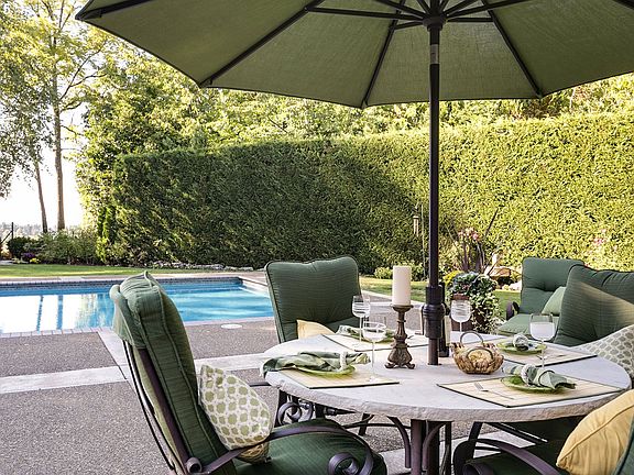 If we had only one word to describe this immaculate 4,810 sq. foot home, it would be ‘spacious.’ Both inside and out, this house has abundant, light-filled, well-planned space. And fortunately, we have far more than one word to describe it. Sitting on one-acre in Bergis Farm Estates, this lot is the largest in the neighborhood and the flat back yard features a beautiful pool, jacuzzi and a large stone patio ready for parties and relaxing. Inside, the kitchen is the heart of the downstairs and is possibly the star of the house. Filled with rich cherry cabinets and top-notch appliances, it is a show stopper. The Sub-Zero refrigerator and two dishwashers have cherry cabinet fronts making the gleaming stainless steel 6-burner Dacor range stand out as a focal point of the space, not to mention a chef’s dream. The counters throughout the kitchen are granite and the oversized central island includes its own sink. A built-in flat screen television is housed above the microwave which is mounted for easy access for both adults and kids. A huge window over the sink looks out to the beautifully landscaped backyard and fills the space with natural light. There is ample room for a large kitchen table in the open-concept space leading to the comfortable family room. The space also boasts a walk-in pantry as well as an additional walk-in storage closet for oversized serving pieces and appliances. Through the butler’s pantry which is fully outfitted with more storage and a large wine refrigerator, is the formal dining room. Just off the soaring two-story foyer, the dining room, and much of the first floor, features white wainscoting, crown moulding and Brazilian cherry hardwood floors. Across the foyer is the formal living room which shares a large two-sided wood-burning fireplace with the adjoining den. A quiet workspace is insured by a set of french doors that close off the den from the living room. Two sets of stairs lead upstairs making access convenient from both the front and the back of the home. Just off the central landing is the master bedroom. A set of large double doors lead into a serene space accented with tray ceilings. Large windows with plantation shutters overlook the rolling hills and fields that surround the edge of the property. The en suite bath features double sinks and a built-in vanity as well as a jetted tub, oversized glass shower and heated tile floors. The upstairs also includes a guest suite with an attached full bath and two additional bedrooms attached by a Jack and Jill bath. A built-in computer desk perfect for homework and studying is situated in the central landing space. An absolutely enormous linen closet lines the hall into the bonus room where there are two additional oversized closets and two access points to the attic which, though unfinished, provides substantial storage space. Back downstairs, a large mudroom/full-service laundry room with even more closet space is located just off the oversized three-car garage. A large, flat driveway flanked by red brick columns leads back from the street providing plenty of space for guest parking and pick-up basketball games. Bergis Farm is a unique location within Lake Oswego because while it has a distinct feeling of being in the country, it is close to all the schools, shopping, restaurants and amenities of both downtown Lake Oswego and greater Portland. Built in 2002, this home has been immaculately maintained and thoughtfully updated to make it an ideal place to call home.