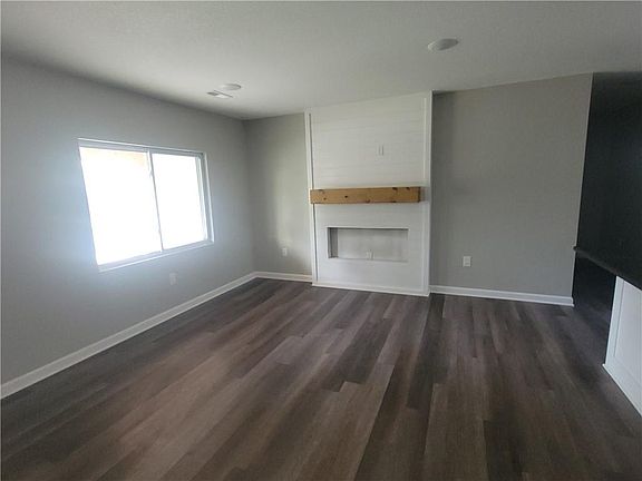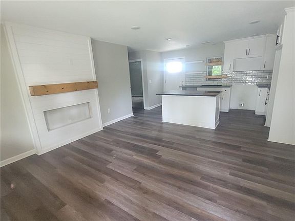 Custom fireplaceSleek granite countertopsBright kitchenPlentiful cabinets