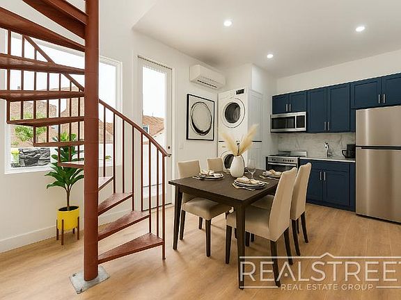 Located on the 5th Floor, this stunning apartment is well worth the walk-up! Be greeted by a gorgeous sun-drenched space, featuring spectacular southwestern views of Brooklyn and Manhattan. The penthouse is meticulously finished, and well-proportioned. The gracious open-concept living room/kitchen comes complete with new appliances, including a full-size dishwasher, and washer/dryer! Ascend the beautiful spiral staircase to find more breathtaking views and two welcoming, queen-size bedrooms with closets!