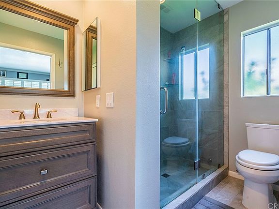 Located on a cul-de-sac in a prestigious area of Granada Hills, this 5 bedroom, 3 bathroom home is just what you've been looking for! The stunning curb appeal is accented by pristine landscaping, brick walkway & porch. Double doors open to a 2-story entry with tile floors. The living room has high ceilings and access to a wonderful balcony off the front of the house. The updated kitchen has a center island with a breakfast bar, white cabinets, granite counter tops and travertine backsplash, stainless steel appliances and beautiful wood like tile flooring. There are two fireplaces, one that warms the living room and a second in the kitchen dining room combo. Open concept floor plan! The Master bedroom has access to the front balcony, two closets, one of which is a walk-in, and a large bathroom with two sinks, soaking tub and a separate shower. There are three additional bedrooms upstairs and another large full bathroom with double sinks. At entry level, there is a large bedroom suite that could be an ideal office, mother-in-law suite or second master bedroom with it's the three-quarter remodeled bathroom. Plantation shutters throughout, ceiling fans and recessed lighting in most rooms. Glass sliders open to beautifully kept private grounds, complete with a large covered patio and huge grassy yard. Enjoy evening gatherings outside, the landscaping has over 100 lights! Three car finished garage, central vac, solar and security features! Highly rated schools, this is the one!