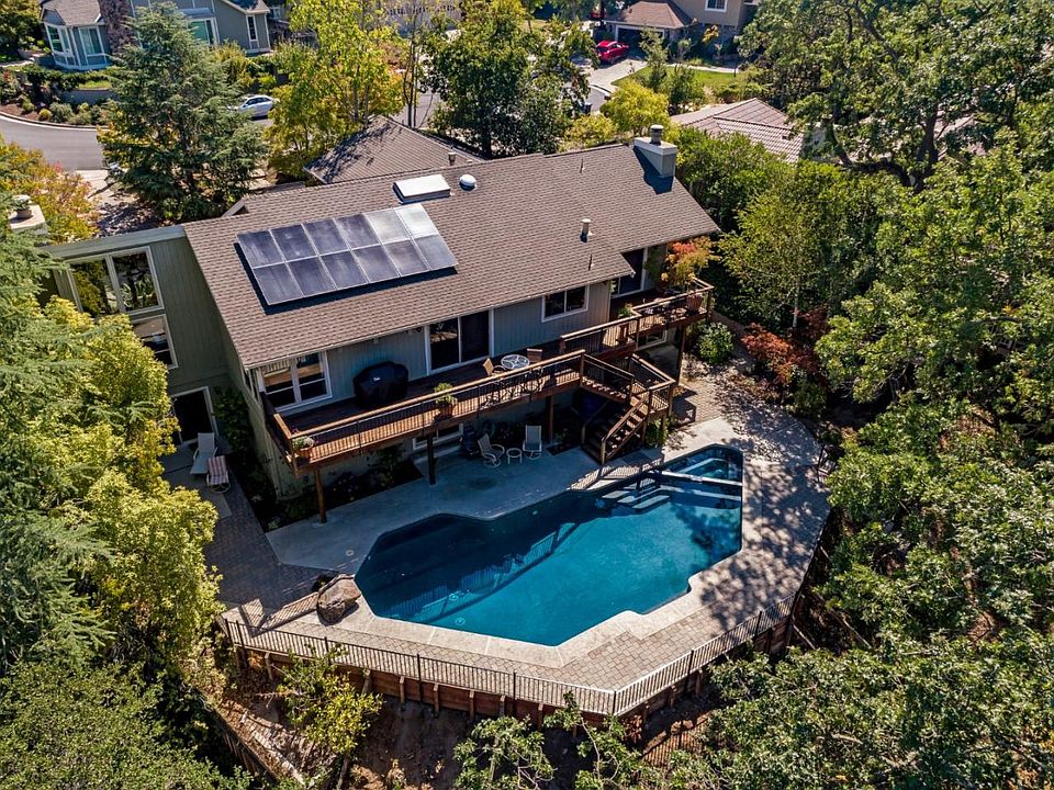 The heart of Monte Sereno beckons you. End of the Cul-de-sac location. Splendid floor plan of appx. 4162 square feet. This home has been perfectly maintained. Beautiful remodeled and updated kitchen and Bathrooms. 5 bedrooms, 3 Bathrooms, both formal dining room and living room have beautiful open wood vaulted ceilings. Fun Family room with bar and wood burning fireplace. Plus a separate game room with your own pool table. Temperature controlled Wine room. Then there is the Backyard oasis with a solar heated pool that overlooks the approximate 3/4 +/- of an acre of open space. One feels like they are out in the country with an in town location. There is also a separate solar system for the home that is owned by the sellers. A short walk to Vasona Park. New bicycle paths or a nice stroll to down town Los Gatos..