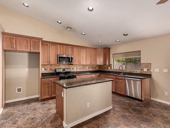 Explore this beautiful 4 bedroom, 2.5 bath home in the highly desirable community of Surprise Farms! Custom tile throughout traffic areas, vaulted ceilings, custom lighting & window coverings, French door exits to the full length covered patio. Gourmet kitchen features stainless appliances including a gas stove, granite countertops, custom tile backsplash, large island & pantry. Huge owner's suite with bay window, separate French door exit to the patio, dual sink vanity, glass block accents, separate shower & garden tub & walk-in closet. Guest bedrooms feature walk-in closets. Spacious, fully landscaped backyard with no neighbors behind. 3 car split garage with built-in cabinets, RV gate & much more!