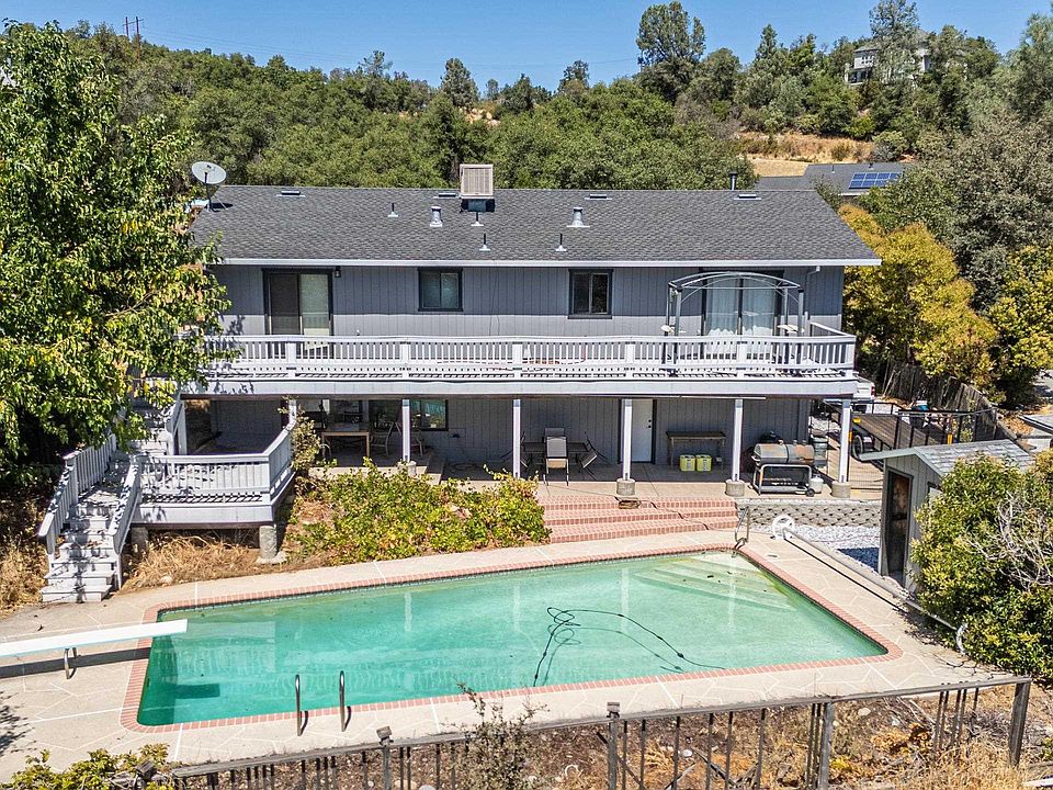 Spacious Home in the Chaparral Heights subdivision with an in-ground pool. Generous parking in front as well as RV side parking and a 2 car garage. The main level features an open floor plan with a wood burning fireplace. The kitchen overlooks the swimming pool and offers a pantry and breakfast bar. The primary bedroom offers 2 closets, a tub/shower combo and mountain views. 2 guest rooms share access to the updated hall bathroom with a tub/shower. Downstairs is versatile offering a BONUS ROOM which can easily be a bedroom, guest quarters, or hobby room as it offers a full bathroom. The attached garage is finished and oversized with full laundry hookups within. Outside you will enjoy the open back deck which sits above the covered patio all overlooking the in-ground pool. This home is in the Soulsbyville School district with public utilities and a short distance to the highway for easy commutes.
