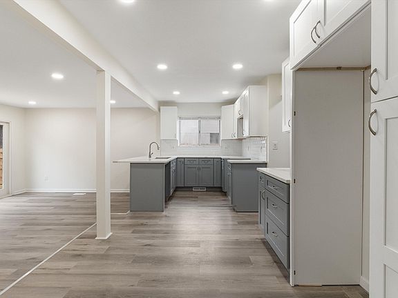 Step into a bright and spacious living room featuring large picture windows and brand-new flooring that flows seamlessly throughout the main level. The open-concept kitchen and dining area are a true highlight—boasting new shaker cabinetry, quartz countertops, subway tile backsplash, stainless fixtures, and a generous island perfect for entertaining or casual meals. The adjoining family room showcases a stunning floor-to-ceiling stone fireplace and provides direct access to the backyard through sliding glass doors.