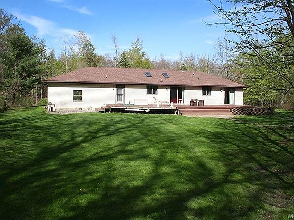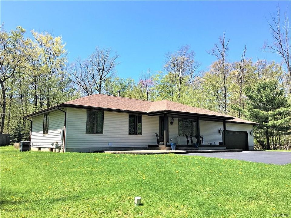 Here's your secluded hideaway ranch, a nature retreat on 1.6 acres in beautiful Lakeview! Driveway leads through the trees and over the brook to a paved porch welcoming you to the front door. Inside, cathedral ceilings arch over the bright open concept living room, dining and skylt kitchen in this 2 bedroom, 1 bath home with a view from every window and a 2.5 car garage--perfect for downsizers who still enjoy peace and privacy. Sliding glass doors lead to huge backyard deck, perfect for birdwatching and enjoying your private green space. The large master bedroom has its own door out to the deck, and a first floor laundry (W/D included) is adjacent to the fully applianced kitchen. There is a full, dry 24x44 basement, already studded for drywall. This home is immaculate, move-in ready!
