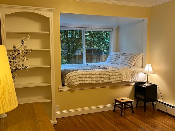The home itself enjoys a fairly private setting overlooking a park. It features an all-new bathroom, fresh paint throughout, hardwood floors, spacious kitchen, propane fireplace, covered front porch with seating, and abundant windows. On street and off street parking included. Groundskeeping is provided. Bedrooms can be furnished to suit.