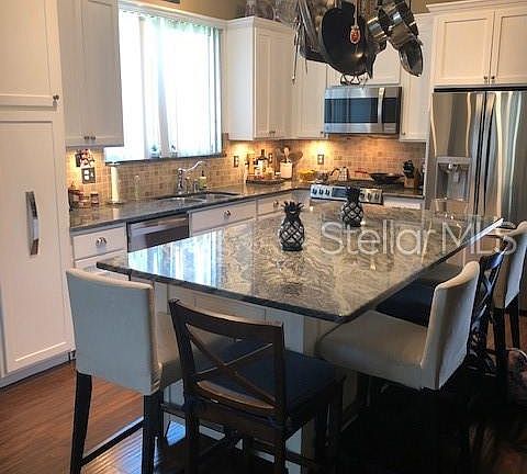 Updated inside and out, this FoxWood at Trinity home shows like a model. Outside boasts a rich earth tone exterior paint color 2017, new impact resistant e-glass double pane windows 2018, and 33'x15' Salt Pool 2010, with waterfalls,jetted seating area, shallow play area and huge patio area, all under newly screened lani pool enclosure. Inside upgraded engineered wood flooring, high base boards, and designer light fixtures. Home has chefs kitchen with tall wood cabinets, 2 large/deep pullout pantries all offering tons of storage. Raised granite kitchen island power at both ends, pullout storage drawers and measures 4ftx7ft and seats 5 adults comfortable. All appliances have been upgraded to SS Kenmore Elite series, 5 burner gas chefs' stove with convection oven and warming drawers. Crown molding through out living areas. Large Master bathroom double granite vanities, stone shower, garden tub and large walk-in closet. Every closet has builtin organizational shelving for tons of storage. Living room dining room combo with chair rail, and room for 8 person table. Within the last 3 years home received new high efficiency variable speed HVAC System.