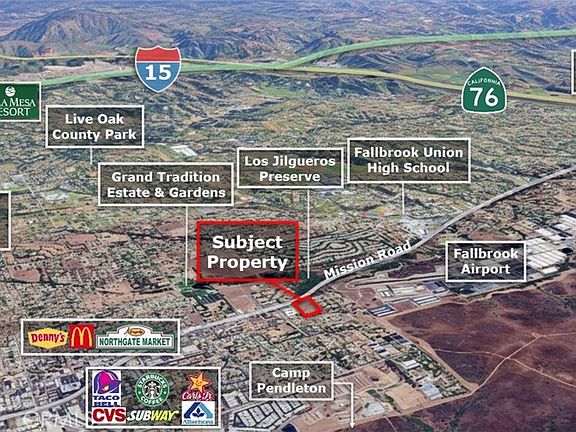 Auction! Residential development opportunity in Fallbrook, CA. This 5.40 acre property offers a superior location on Mission Road, close to top-rated schools, retail centers and Camp Pendleton. Zoned Rural Residential (RR) potential for 13 lots and 2 affordable with Density Bonus (AB 1287/SB9) verify with San Diego County. Home resale values over $1,300,000 in the immediate vicinity. Seller will consider contingencies with your offer.