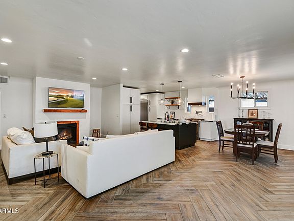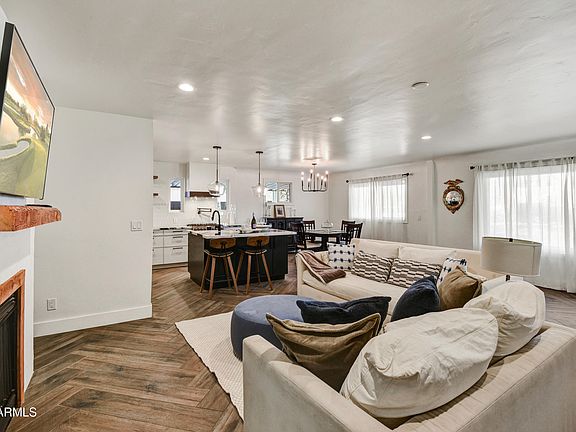 Fabulous mid-century modern meets chic modern farmhouse in this Central Phoenix stunner! Located in the coveted St. Gregory's neighborhood, this light-filled open-concept home features a spacious kitchen/great room, dual-pane windows, hardwood bedroom floors, porcelain tile in main living areas, N/S exposure and lush grassy front & back yards. Designer kitchen boasts extra-large cabinetry, Italian stone countertops, fireclay sink, pot filler and Frigidaire Professional appliances, including an impressive 64'' fridge/freezer, slide-in gas range and dishwasher, plus butler's pantry with wine chiller and full-size inside laundry. Retreat to the spa-like primary suite with an extra-large walk-in shower with dual shower heads, skylight, cement tile, enclosed toilet room, custom furniture-style vanity and wall-mount faucets. The hall bath features a brand new dual-sink vanity with designer finishes. Brand new electrical panel, cozy gas fireplace, and modern finishes throughoutthis level of style and quality is nearly impossible to find at this price in Central Phoenix!