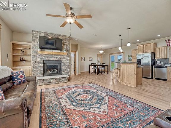 Welcome home to this spectacular home situated on a 2.61 acre lot in Blue Sage. This updated, open-concept rancher features: breathtaking Pikes Peak and mountain views, a newly finished basement, new furnace, new A/C, new tankless water heater, new flooring, newer roof, stainless steel kitchen appliances, newer washer and dryer, knotty pine solid core two-panel doors, knotty pine trim, fenced area for a dog run, storage shed, composite upstairs deck, and the list goes on and on. The gourmet eat-in kitchen features a solid surface island (perfect for buffet-style entertaining), stainless steel appliances, stainless steel sink, tile backsplash, walk-in pantry, and access to the backyard. The adjacent living room includes a gas fireplace (inclusive of a wooden mantle and stacked stone), built-in shelving, and access to the composite upper deck (ideal for family and friend gatherings). Retreat to the spacious primary suite, which boasts a private bath with an extended tiled walk-in shower and rain shower head, dual sinks with solid surface countertops, dual walk-in closets with custom shelving systems, custom cabinetry, and new flooring. Two secondary bedrooms and a full bathroom complete the main level. Make your way downstairs where you will appreciate a full secondary suite (versatile for multi-generational living) with an oversized closet/custom shelving, attached en suite, murphy bed, and room for a desk/workout equipment/sitting area. This level also offers a large family room/rec room (featuring another refrigerator and chest freezer) that can be utilized for game nights, get togethers, or hosting big sporting events. The utility room (complete with washer and dryer), under-stair storage, garage access, and front door access finish out this level. You will appreciate the serene setting and true tranquility this lot features, as well as the opportunity to expand. This home checks all the boxes for comfort, function, and multi-generational living.