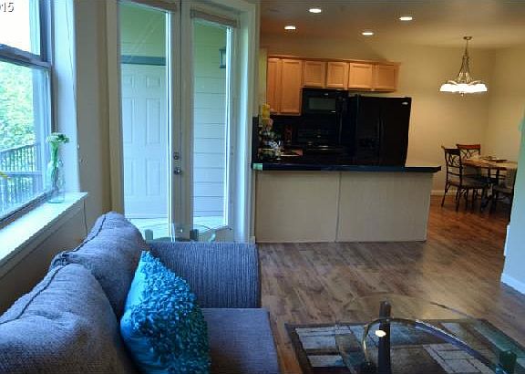Well cared for condo w/electric fireplace, beautiful floors, high ceilings, granite, appliances, washer & dryer. Resident occupancy includes the community clubhouse that hosts an exercise room, kitchen, full bathrooms, double sided fireplace, and great room for entertaining family and guests! Views of creek and nature from deck. Country feel. Close to shopping and bus line.