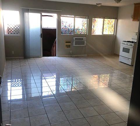 like 2 apts. in one. very contemp. studio, w/custom details thruout, slick marble flrs, ac, granite counters, huge L-shaped step-down, private, enclosed PATIO/YARD. w/palmtrees & covering... perfect for ONE dog. all appl., NEW vanities & l.e.d. lights 12 months