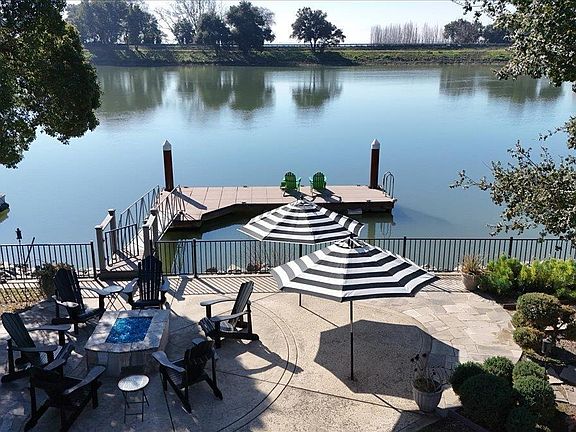 A Waterfront home in California on a private island on the Sacramento River .... Welcome to a serene retreat nestled on a private island, where elegance meets tranquility. This exquisite residence in California invites you to experience a harmonious blend of comfort and sophistication. Spanning 1,417 square feet, this home offers a thoughtfully designed layout featuring 3 spacious bedrooms and 2 bathrooms. Each room is a testament to refined living, with ample natural light enhancing the graceful ambiance throughout. The expansive living with vaulted ceilings enjoys a gas fireplace, panoramic views of the river, and 2 sets of floor-to-ceiling retracting glass doors opening to an open-air outdoor patio with amazing sunset views. The space flows seamlessly into a gourmet kitchen, perfect for culinary endeavors and intimate gatherings. The kitchen is adorned with a gas cooktop, double ovens, a microwave drawer, and granite counters with a leather finish. Step outside to discover a generous 11,997-square-foot lot, offering a private oasis for relaxation and outdoor enjoyment. The possibilities are endless, whether you envision a lush garden, a serene patio, or a vibrant entertainment space. 2 boat docks. Vacation every day on a private island.