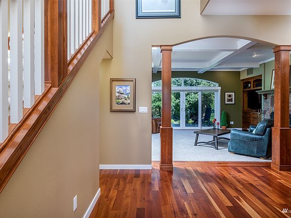 Incredible opportunity to own a very special home. Located on a beautifully landscaped storybook 1/2 ac Creekside lot in the heart of Lynden! Meticulously maintained gardens bring privacy & a sense of peace. Top quality craftsmanship - cherry floors, custom built-ins, 10' foot coffered ceilings, A/C, & an efficient wood burning fireplace for cozy winter nights. Chefs kitchen w/granite counters, butcher block island w/seating & storage, writers desk, KitchenAid double oven, brand new SS fridge & gas range. Welcoming spacious main floor owner's suite overlooking Fishtrap Creek includes a walk-in closet, double sinks, & a double headed shower. Relax on your covered patio or sit alongside the meandering creek. You may never want to leave home!