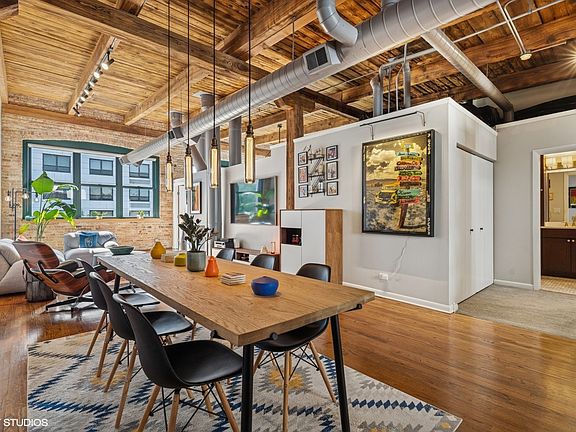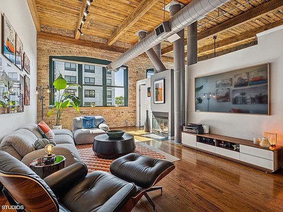 Rarely available top-floor timber loft condo in the heart of Bucktown's sought-after Paulina Lofts. Just steps from the 606 Trail, this classic Chicago loft offers soaring 15-foot ceilings, exposed brick throughout, and an abundance of character. The spacious 2-bedroom, 2-bathroom layout includes a dramatic open-concept living and dining area, a double-sided wood-burning fireplace with a gas starter-shared by both the living room and the primary suite for a cozy, elevated feel. The updated kitchen includes custom cabinetry, quartz countertops, stainless steel appliances, and a classic subway tile backsplash. One of only five units in the building with a second-floor den and wet bar that opens to a private rooftop deck. Stunning western views perfect for sunset entertaining. Second bedroom with huge windows for natural light and full walls enclose the space. Both bathrooms have been thoughtfully updated since the building's conversion. Exterior parking included. Situated in an outstanding location near the 606/Walsh Park, this condo provides easy access to the Metra and Damen Blue Line, and quick access to 90/94 via Armitage. You'll love being close to everything Bucktown and Wicker Park have to offer, including trendy shops, vibrant nightlife, and diverse dining options. Don't miss this opportunity to own a beautiful, spacious, and updated condo in one of Chicago's most sought-after neighborhoods.
