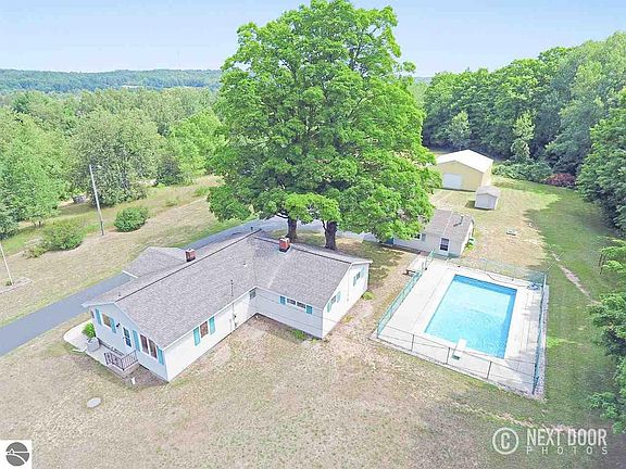 Countryside charmer! Sixteen acres of rolling hills, hardwoods, creek and private pond located just 1/4 mile south of Platte River public access. This 3 bedroom/2 bath home features a finished basement with fireplace & wet bar, has been well cared for and is move-in ready. Property includes an attractive 16' x 32' in-ground pool, detached garage with pool equipment and changing room, 30' x 40' pole barn with power, garden shed/work shop and storage shed. Enjoy this quiet country setting with the convenience of easy access to US-31 just south of Honor centrally located to the communities of Beulah, Frankfort and Traverse City as well as the Sleeping Bear National Park.